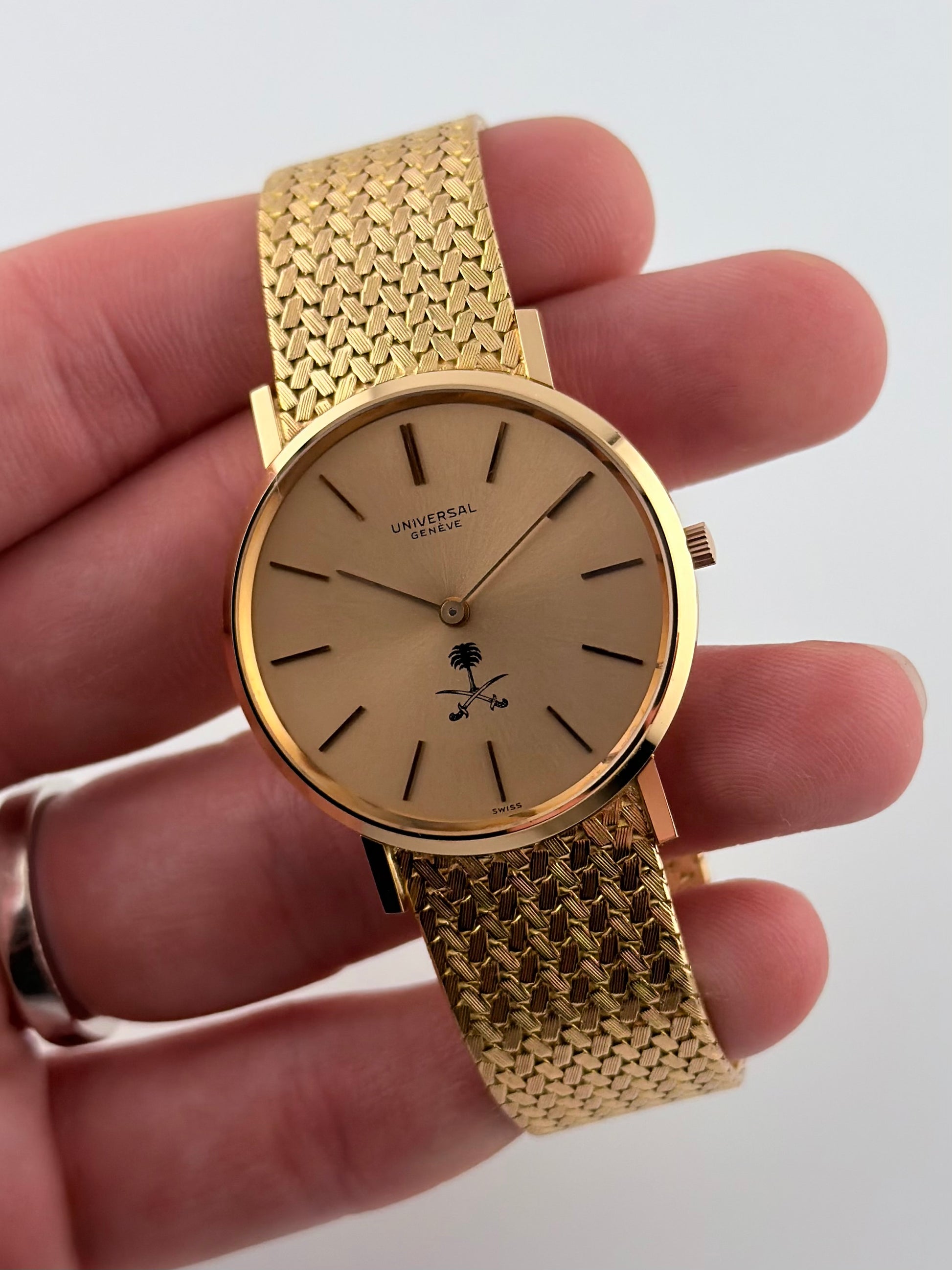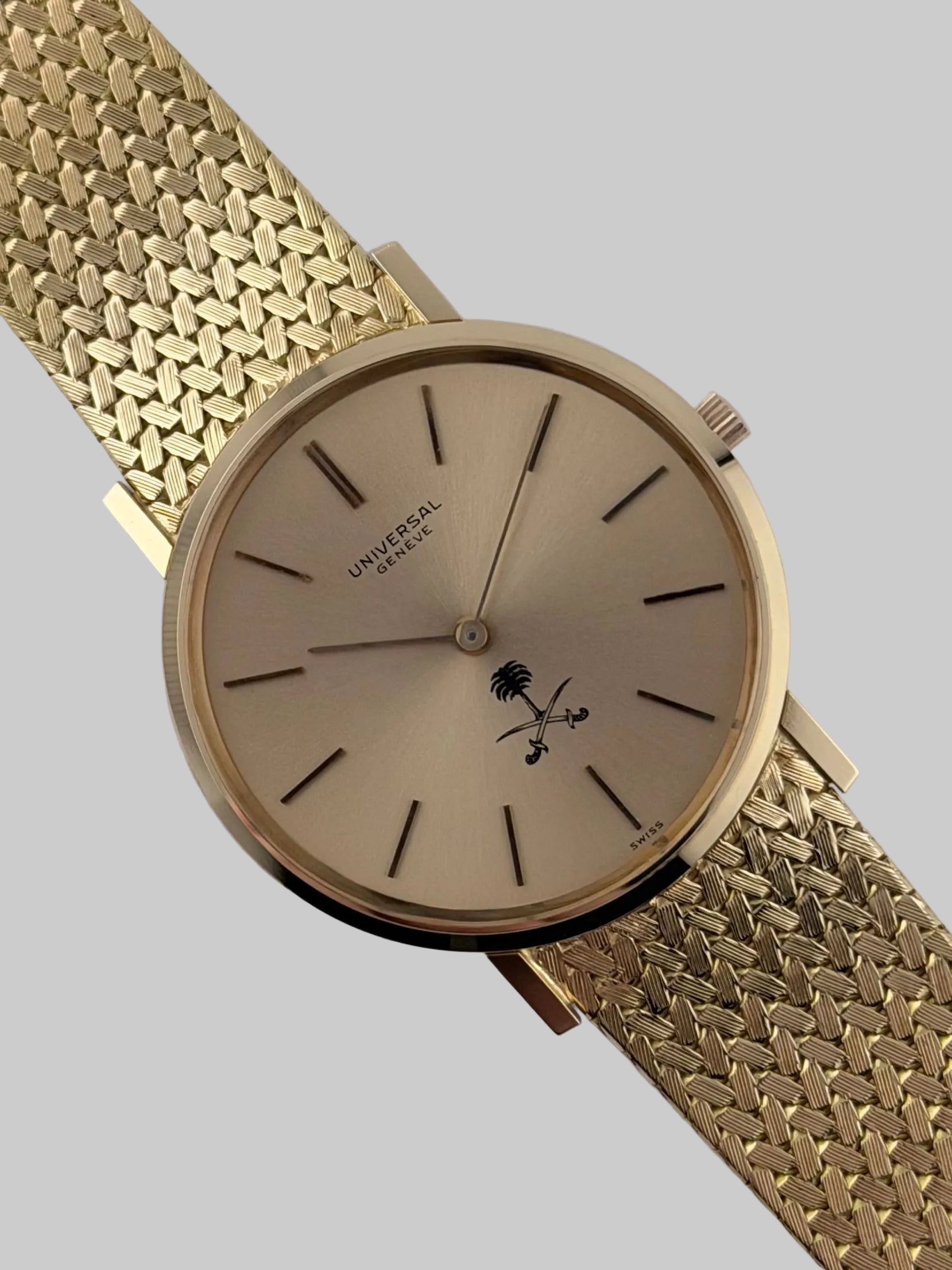 An exceptional and incredible rare Universal Geneve dress watch commissioned for Saudi royals and officials, featuring the iconic palm tree and crossed swords emblem. Preserved in new old stock, unworn condition, this solid 18ct gold timepiece represents a rare and highly collectible example of mid-century Swiss craftsmanship.