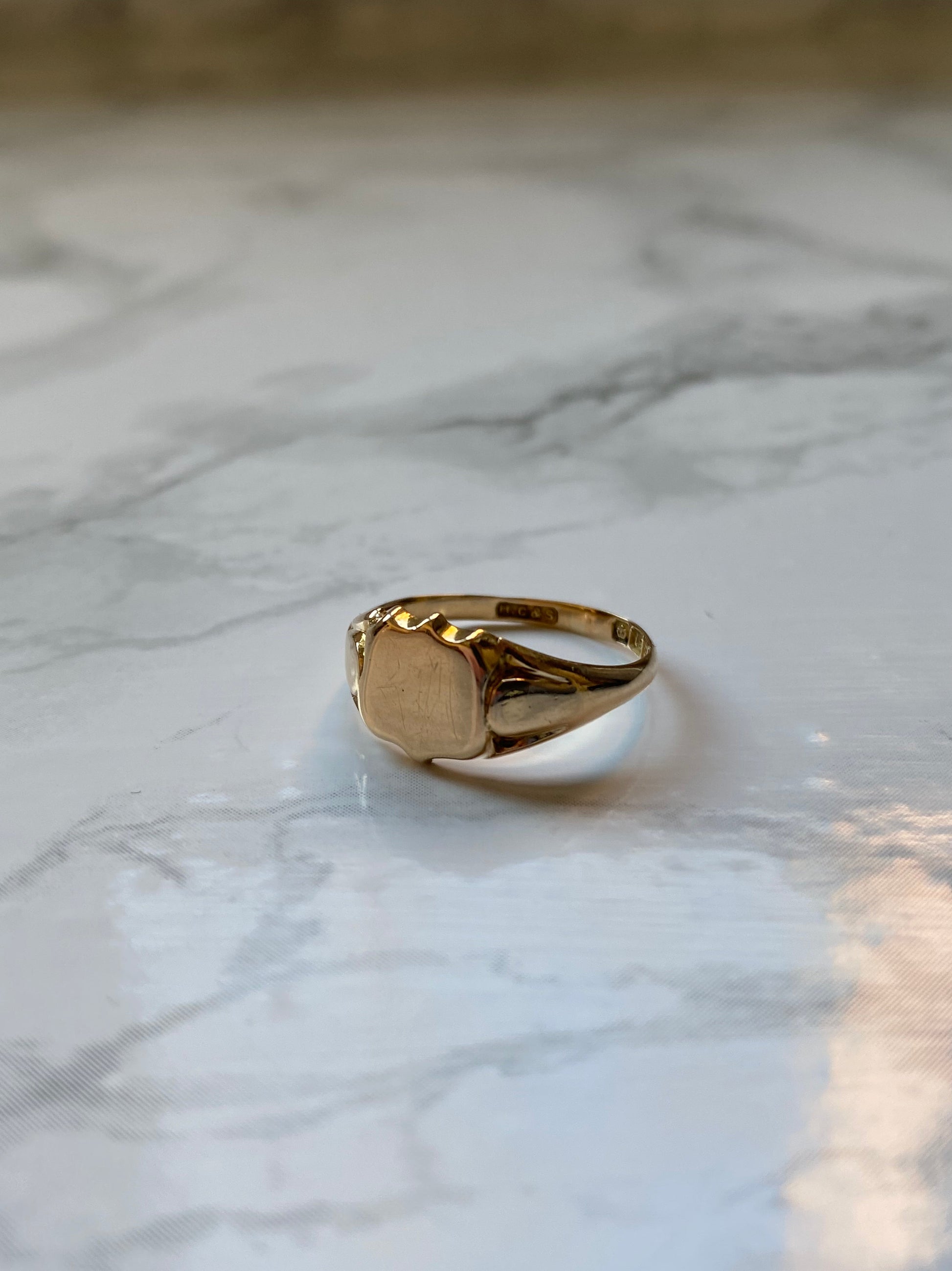 This is a beautiful early 20th century 18ct gold shield signet ring. It features the maker's marks “H G and S”.