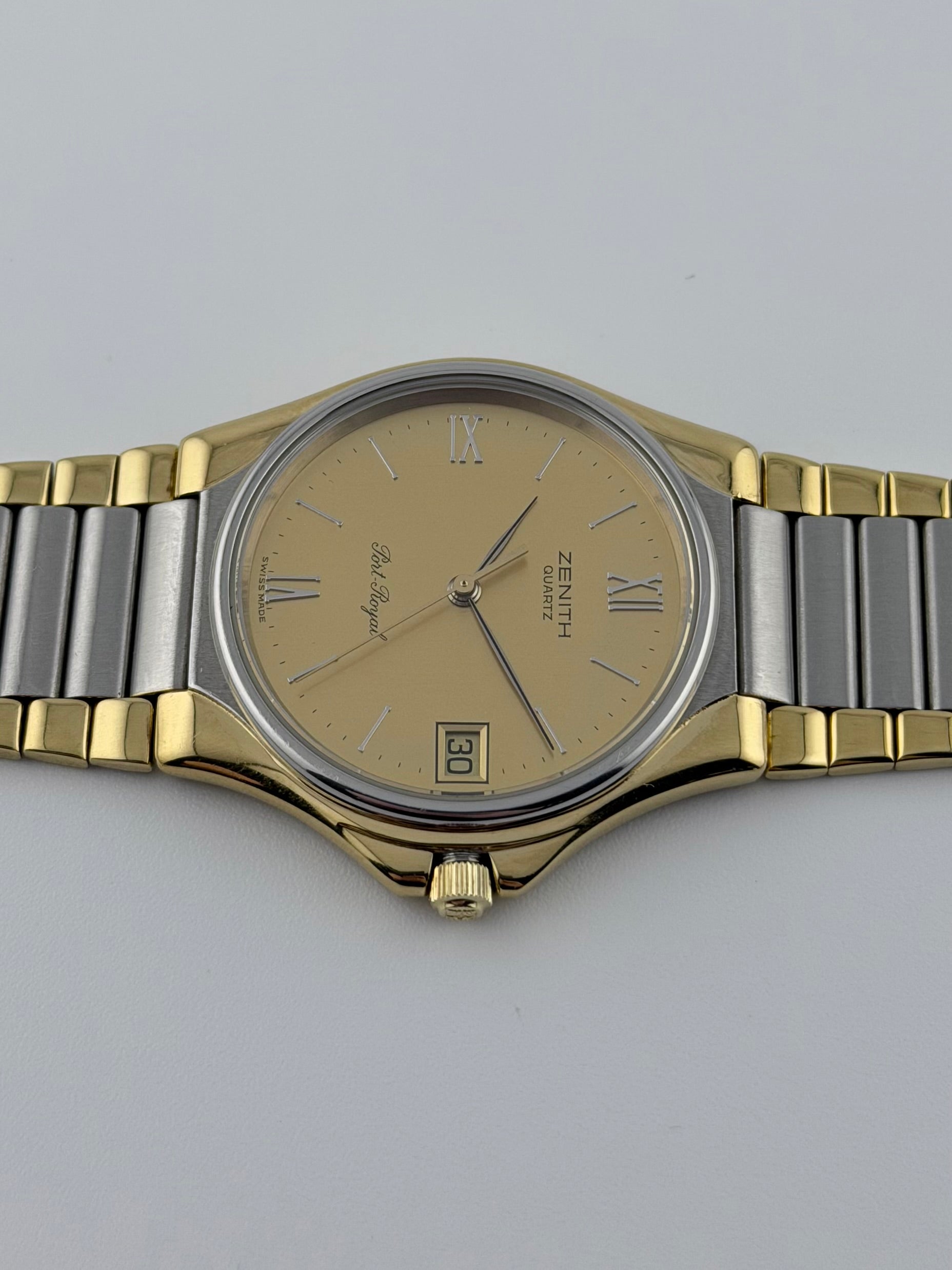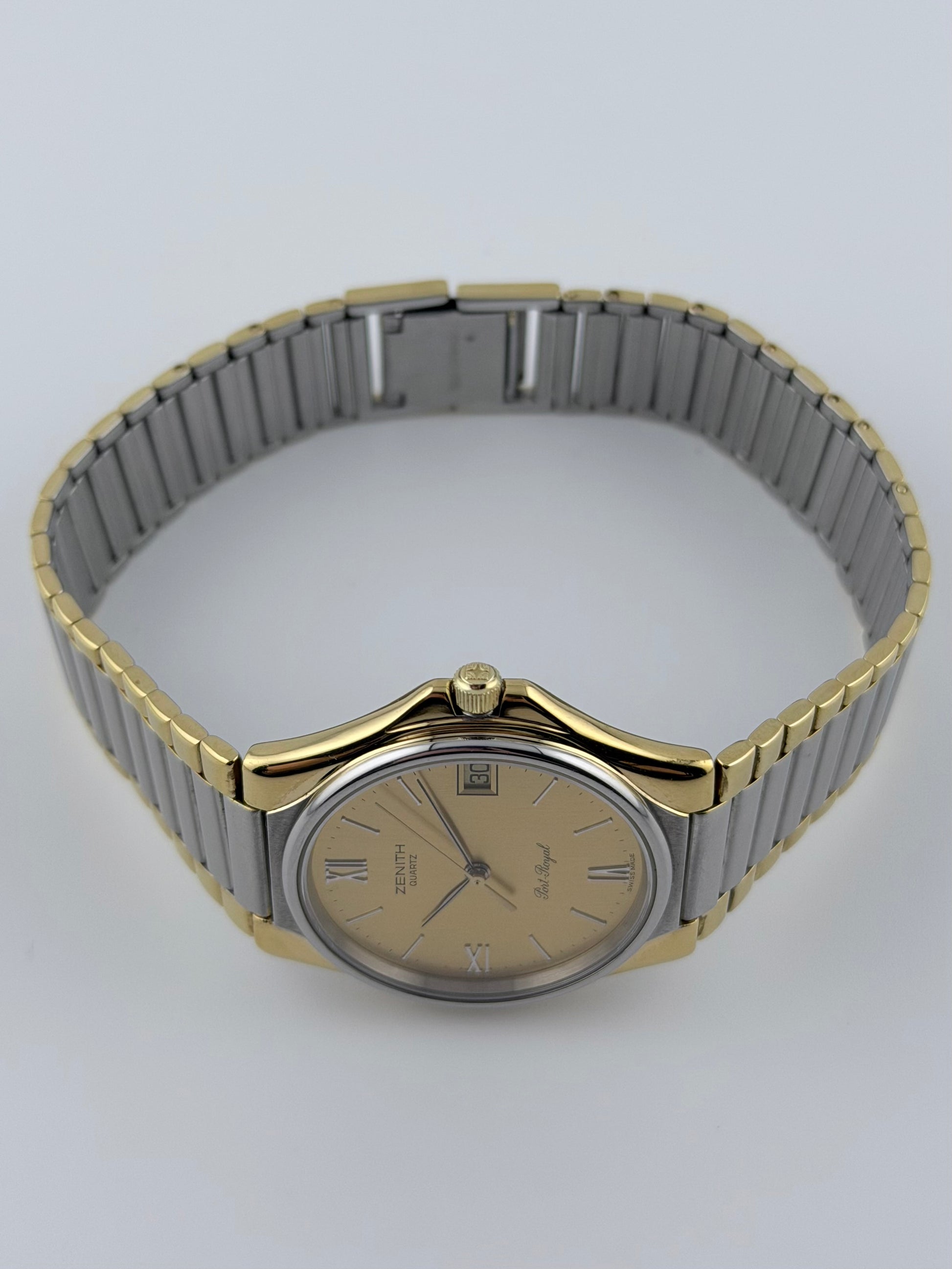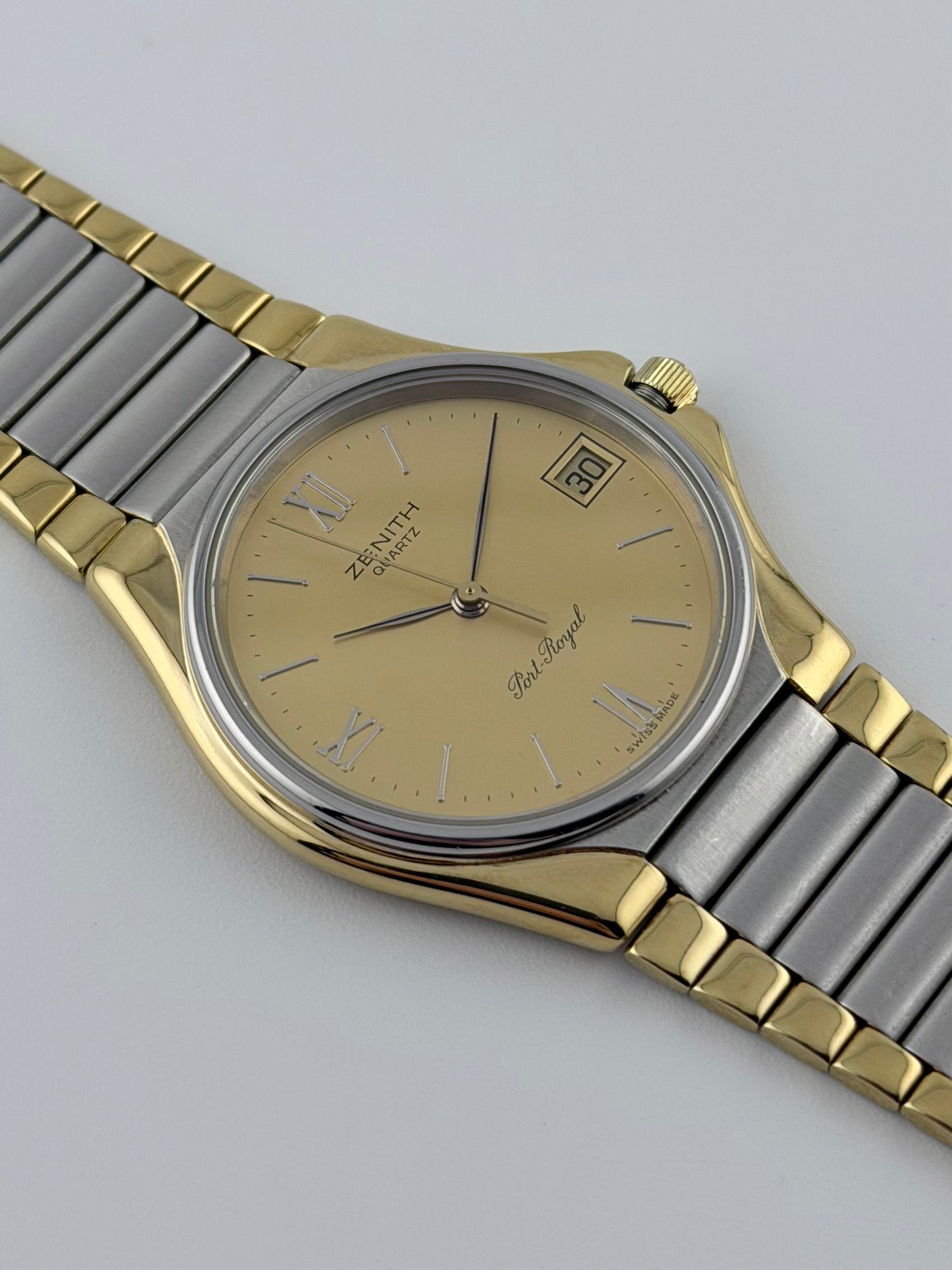 This is a beautiful vintage Zenith Port Royal from the 1990s which features a stainless steel and gold plated case and bracelet with a fully functional date complication. This piece is in extremely nice condition and close to the point at which we would describe it as near new old stock. The watch is working extremely well and keeping fantastic time.