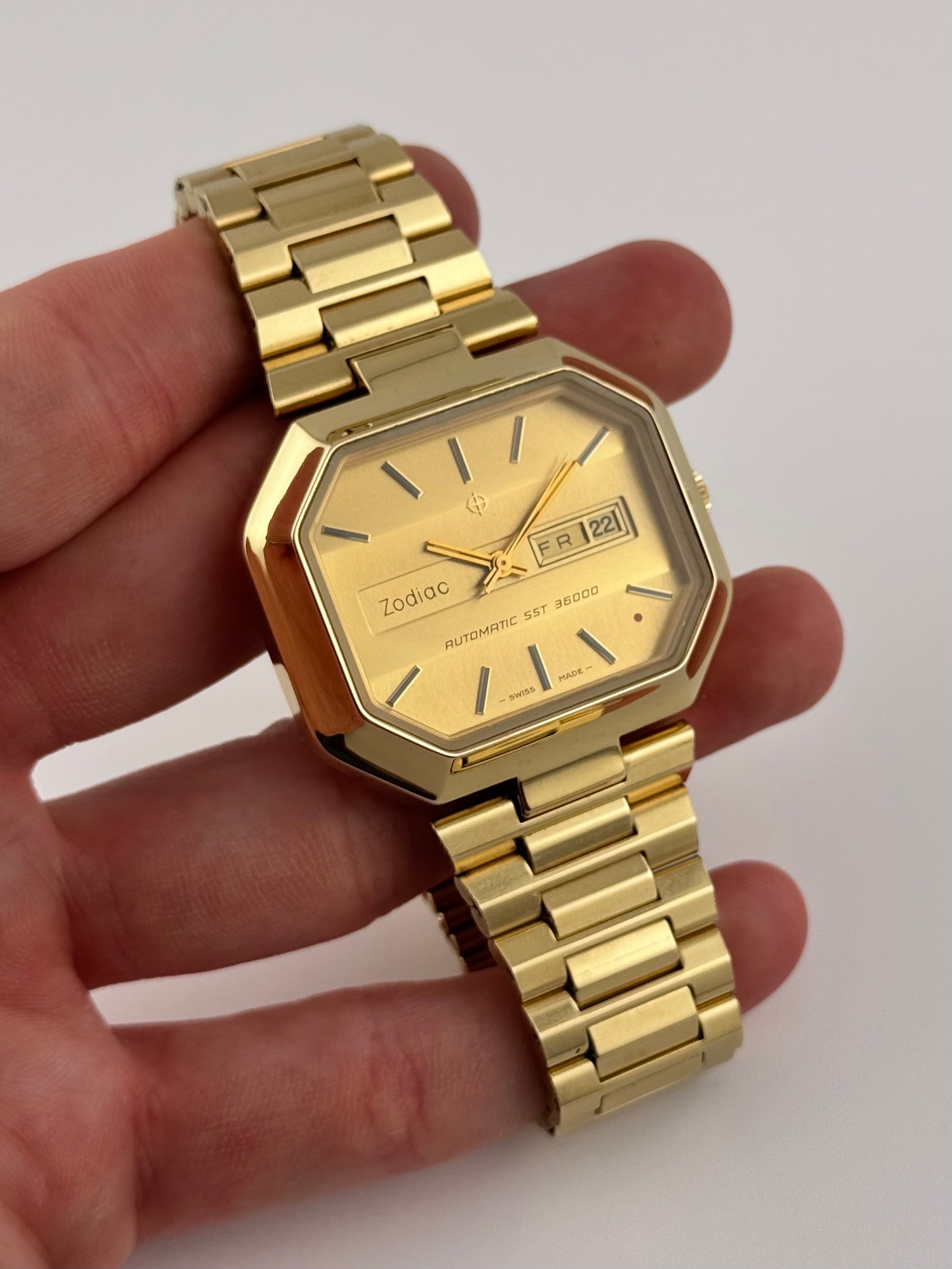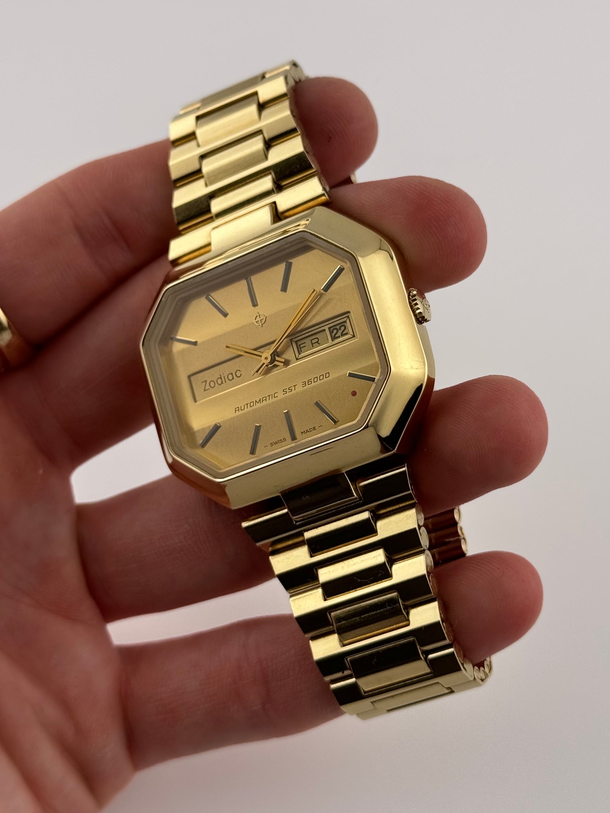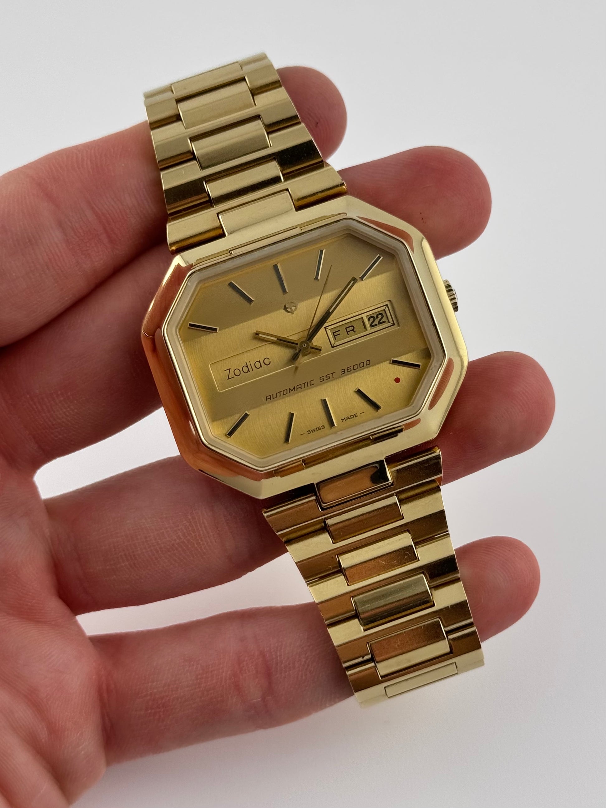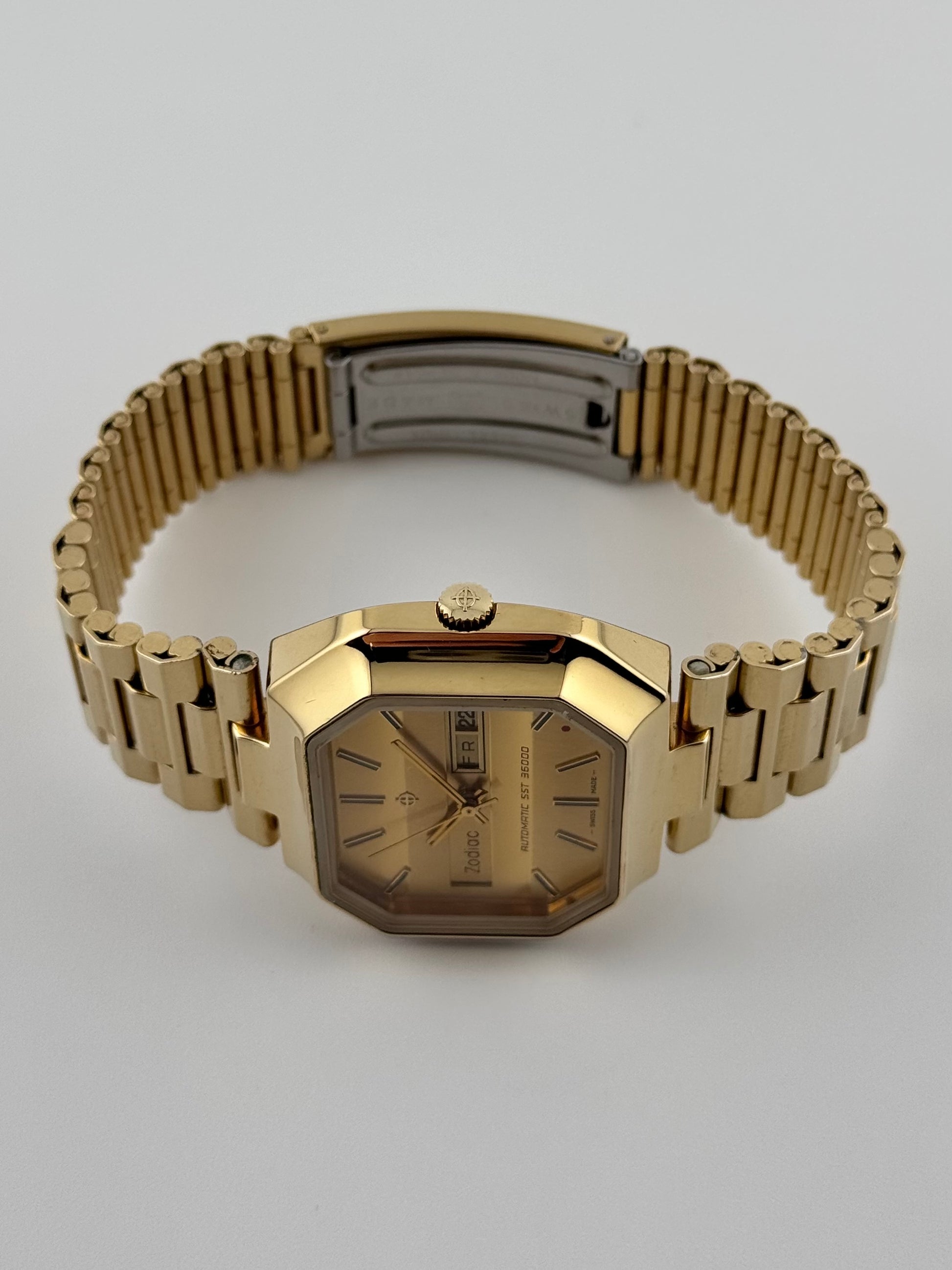 This is something very different which is sure to create a talking point wherever you go. This Zodiac SST 36,000 as the design suggests was made in the 1970s. The beautiful octagon style design with a gold coloured dial, encompassing black baton markets and a fully functional day date complication is a real eye catcher. This particular example is very close to new old stock and it still retains its Zodiac sticker on the case back. A good sized watch with a 40mm width, this one a real beauty. Mechanically, the watch is running perfectly with the high beat movement working as it should.