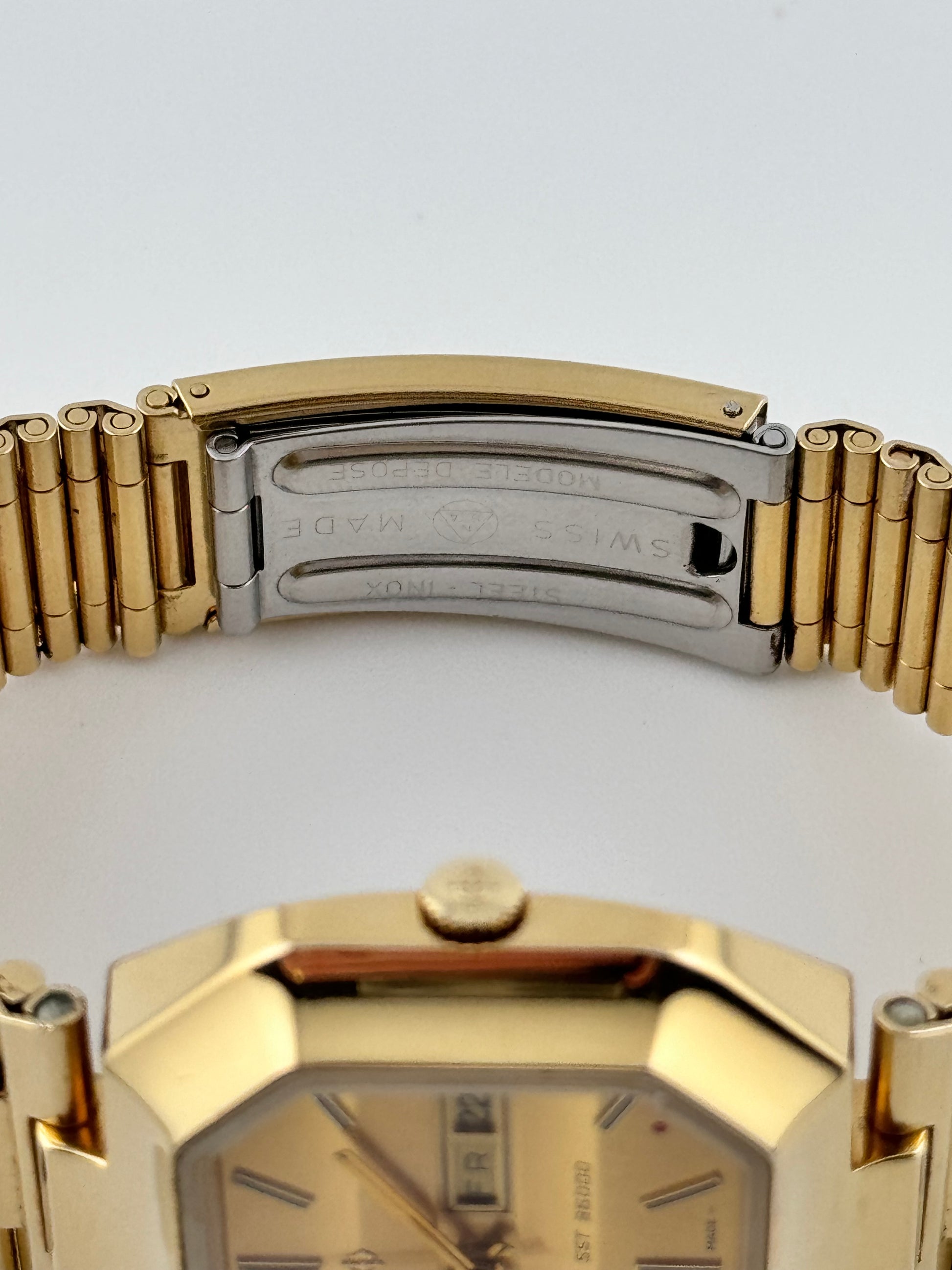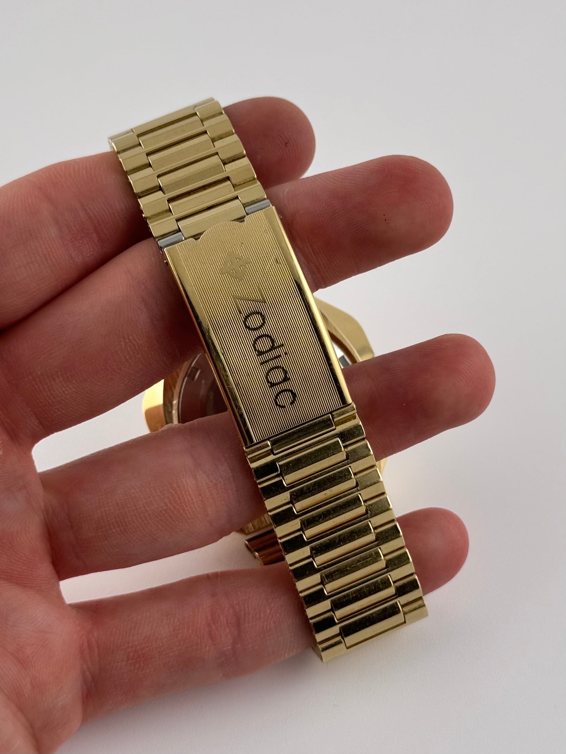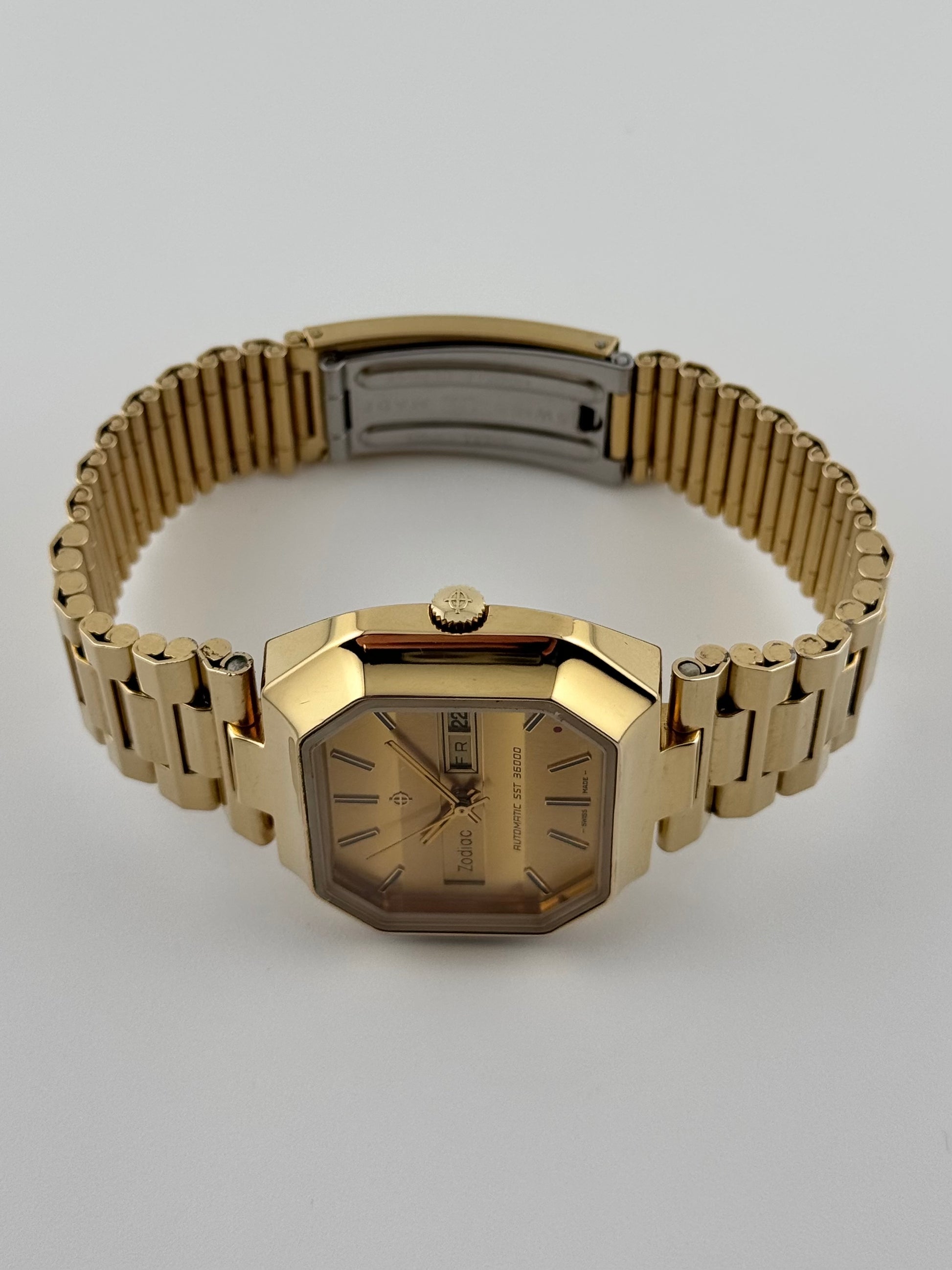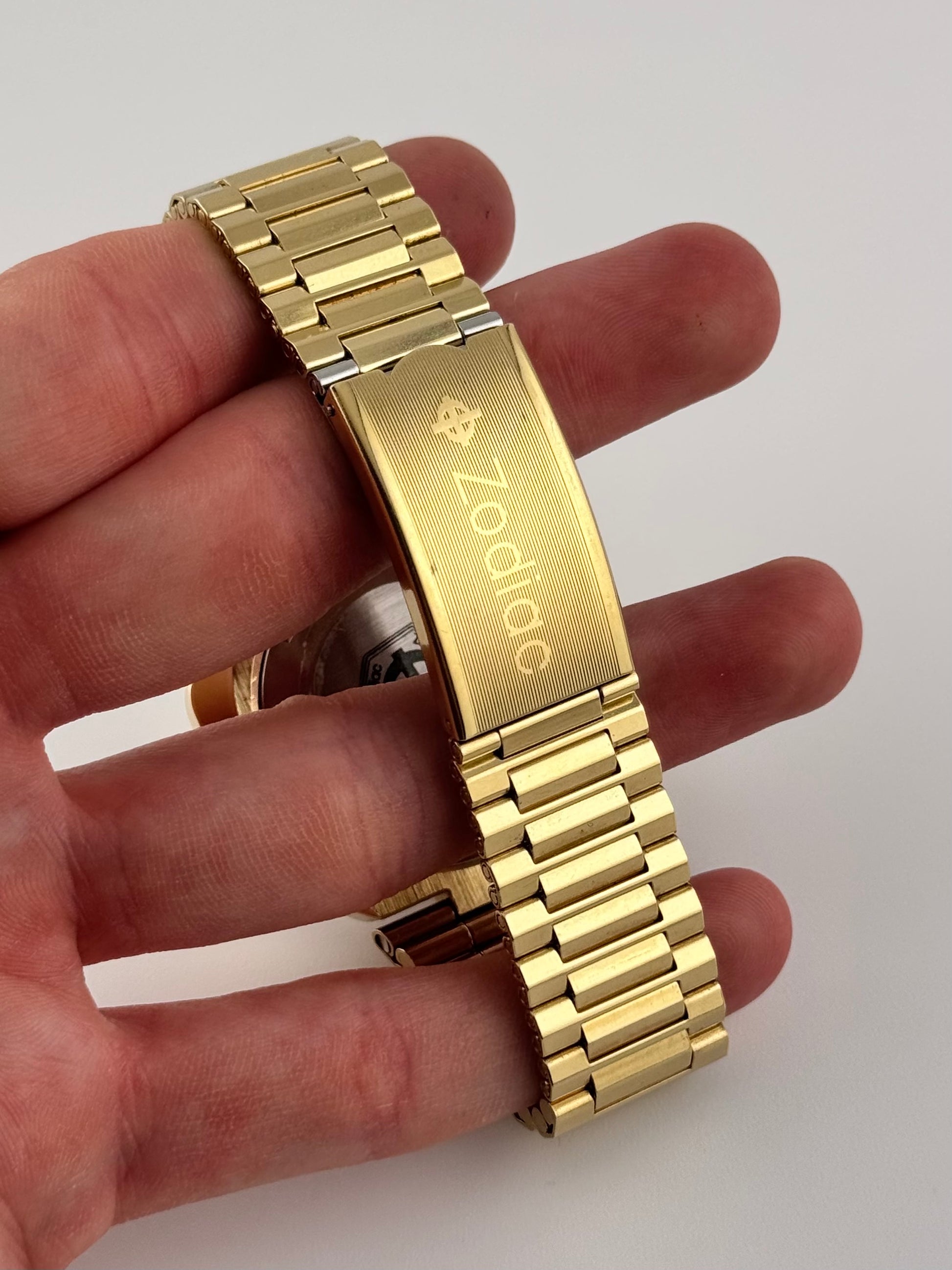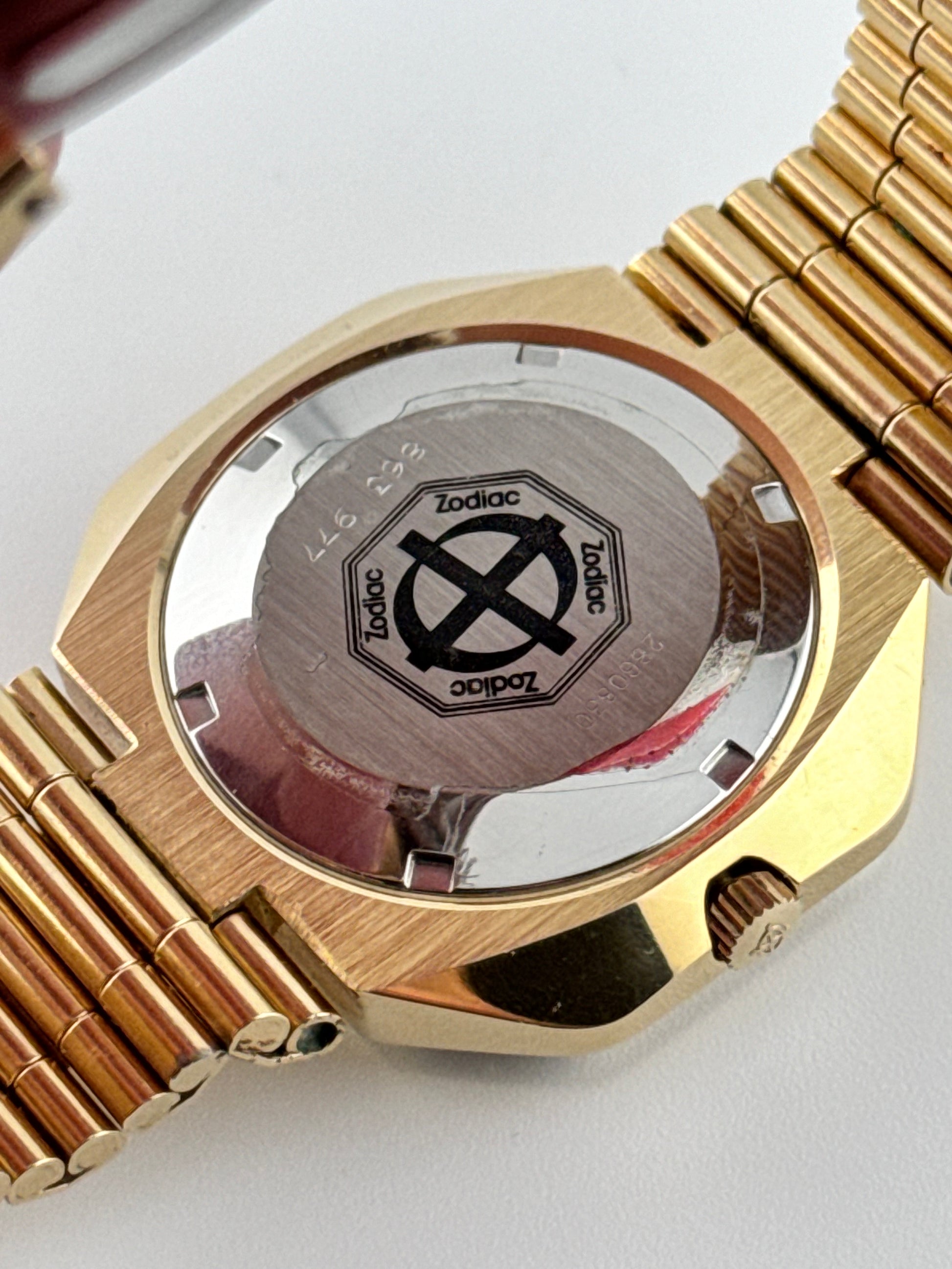 This is something very different which is sure to create a talking point wherever you go. This Zodiac SST 36,000 as the design suggests was made in the 1970s. The beautiful octagon style design with a gold coloured dial, encompassing black baton markets and a fully functional day date complication is a real eye catcher. This particular example is very close to new old stock and it still retains its Zodiac sticker on the case back. A good sized watch with a 40mm width, this one a real beauty. Mechanically, the watch is running perfectly with the high beat movement working as it should.